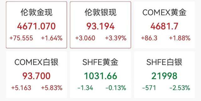 国际黄金和白银价格 1月19日均创历史新高 伦敦现货黄金价格 来源:红星新闻 一度涨破每盎司4690美元 现货白银价格 一度突破每盎司94美元 | 伦敦金现 | 伦敦银现 | COMEX黄金 | | --- | --- | --- | | 4671.070 | 93.194 | 4681.7 | | +75.555 +1.64% | +3.060 +3.39% | +86.3 +1.88% | | COMEX白银 | SHFE黄金 | SHFE自银 | | 93.700 | 1031.66 | 21998 | | +5.163 +5.83% | -1.34 -0.13% | -571 -2.53% | Wind截图 截至发稿 伦敦金现涨1.64% 报4671.07美元/盎司 伦敦银现涨3.39% 报93.194美元/盎司 COMEX黄金涨1.88% 报4681.7美元/盎司 COMEX白银涨5.83% 报93.7美元/盎司 国内黄金饰品价格对比显示 多家黄金珠宝品牌公布的 境内足金首饰价格大涨: 老凤祥报价1456元/克 老庙黄金报价1459元/克 周生生报价1451元/克 你没听错 就是被戏称为"破铜烂铁" ...