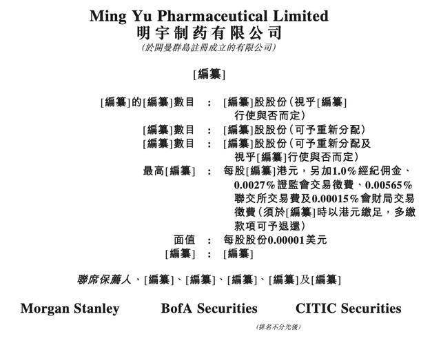 | [編纂]的[編纂]數目 : [編纂]股股份(視乎[編纂] | | --- | | 行使與否而定) | | : [编纂]股股份(可予重新分配) [编纂]數目 | | [編纂]數目 : [編纂]股股份(可予重新分配及 | | 視乎[編纂]行使與否而定) | | 最高[編纂] : 每股[編纂]港元,另加1.0%經紀佣金、 | | 0.0027%證監會交易徵費、0.00565% | | 聯交所交易費及0.00015%會財局交易 | | 徵費(須於[編纂]時以港元繳足,多繳 | | 款項可予提還) | | 面值 : 每股股份0.00001美元 | | [编纂] : [编纂] | | September 1999 1999 Property Comments of the comments of and the same of the may be | 瑞财经 吴文婷11月24日,明宇制药有限公司(以下简称"明宇制药")在港交所递交招股书,联席保荐人包括摩根士丹利、美银证券和中信证券。 明宇制药是一家于2018年成立的接近商业化的生物技术创新企业。 公司具有双重增长引擎,包括基于专有抗体偶联药物(ADC)平台及一款新 ...
