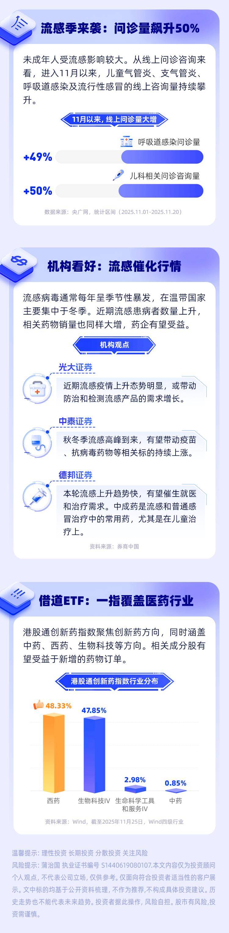 流感季来袭: 问诊量飙升50% 未成年人受流感影响较大。从线上问诊咨询来 看,进入11月以来,儿童气管炎、支气管炎、 呼吸道感染及流行性感冒的线上咨询量持续攀 升。 11月以来,线上问诊量大增 菲 呼吸道感染问诊量 +49% 儿科相关问诊咨询量 +50% 数据来源:央广网,统计区间(2025.11.01-2025.11.20) 机构看好:流感催化行情 流感病毒通常每年呈季节性暴发,在温带国家 主要集中于冬季。近期流感患病者数量上升, 相关药物销量也同样大增,药企有望受益。 机构观点 光大证券 近期流感疫情上升态势明显,或带动 防治和检测流感产品的需求增长。 中泰证券 秋冬季流感高峰到来,有望带动疫苗 、抗病毒药物等相关标的持续上涨。 德邦证券 本轮流感上升趋势快,有望催生就医 和治疗需求。中成药是流感和普通感 冒治疗中的常用药,尤其是在儿童治 疗上。 资料来源:券商中国 借道ETF: 一指覆盖医药行业 港股通创新药指数聚焦创新药方向,同时涵盖 中药、西药、生物科技等方向。相关成分股有 望受益于新增的药物订单。 来源:中信建投证券 来源:券商研报精选 ...