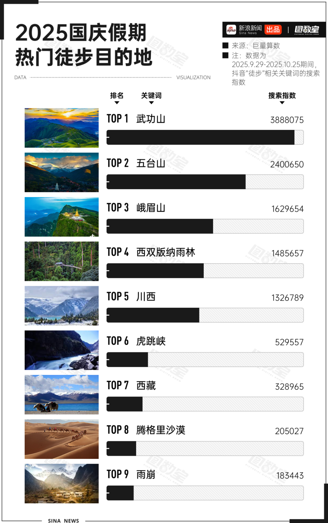本文来自微信公众号:图数室,作者:图数室,题图来自:AI生成 当City Walk 的余温尚未散尽,一场"Mountain Walk"的浪潮席卷而来。从江西武功山的绵延草甸,到川西高原的雪山湖泊,从腾格里沙漠的辽阔沙地,到 西双版纳的茂密雨林,越来越多的人不满足于城市漫步,而是背起行囊,走向山野。 据平台数据显示,仅2025年中秋国庆假期,"户外徒步"搜索量同比增长超过253%。徒步,正从一项专业运动,逐渐"破圈"成为年轻人热衷的旅行方式。 然而,徒步并非仅有诗与远方。随着参与人数的增加,迷路、坠崖、失温等事故频发,仅2024年,就发生了三百余起事故。徒步是人人都能徒吗? 徒步爆火 2025年的国庆中秋假期,City Walk 已经不够city了,取而代之的是Mountain Walk——徒步。各个年龄段的游客奔向旷野,用双脚丈量天地。据美团统 计,国庆中秋假期"户外徒步"关键词的搜索量同比增长超253%。 2025年中秋国庆假期,"徒步"的相关搜索指数显示,江西武功山成为最热徒步目的地,山西五台山、四川峨眉山等传统名山热度不减。 同时,西双版纳、川西、虎跳峡、西藏、腾格里沙漠和雨崩等地,以雨林、峡谷、高原、 ...