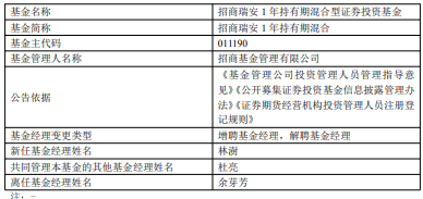 | 基金名称 | 招商瑞安 1年持有期混合型证券投资基金 | | --- | --- | | 基金间称 | 招商瑞安 1年持有期混合 | | 基金主代码 | 011190 | | 基金管理人名称 | 招商基金管理有限公司 | | 公告依据 | 《基金管理公司投资管理人员管理指导意 见》《公开募集证券投资基金信息披露管理办 | | | 法》《证券期货经营机构投资管理人员注册登 | | | 记规则》 | | 基金经理变更类型 | 增聘基金经理,解聘基金经理 | | 新任基金经理姓名 | 林謝 | | 共同管理本基金的其他基金经理姓名 | 杜亮 | | 离任基金经理姓名 | 余芽芳 | | 基金名称 | 招商瑞泰1年持有期混合型证券投资基金 | | --- | --- | | 基金简称 | 招商瑞泰 1年持有期混合 | | 基金主代码 | 012965 | | 基金管理人名称 | 招商基金管理有限公司 | | 公告依据 | 《基金管理公司投资管理人员管理指导意 见》《公开募集证券投资基金信息披露管理办 法》《证券期货经营机构投资管理人员注册登 | | | 记规则》 | | 非令经理变更类型 | 增聘基金经理,解聘基 ...