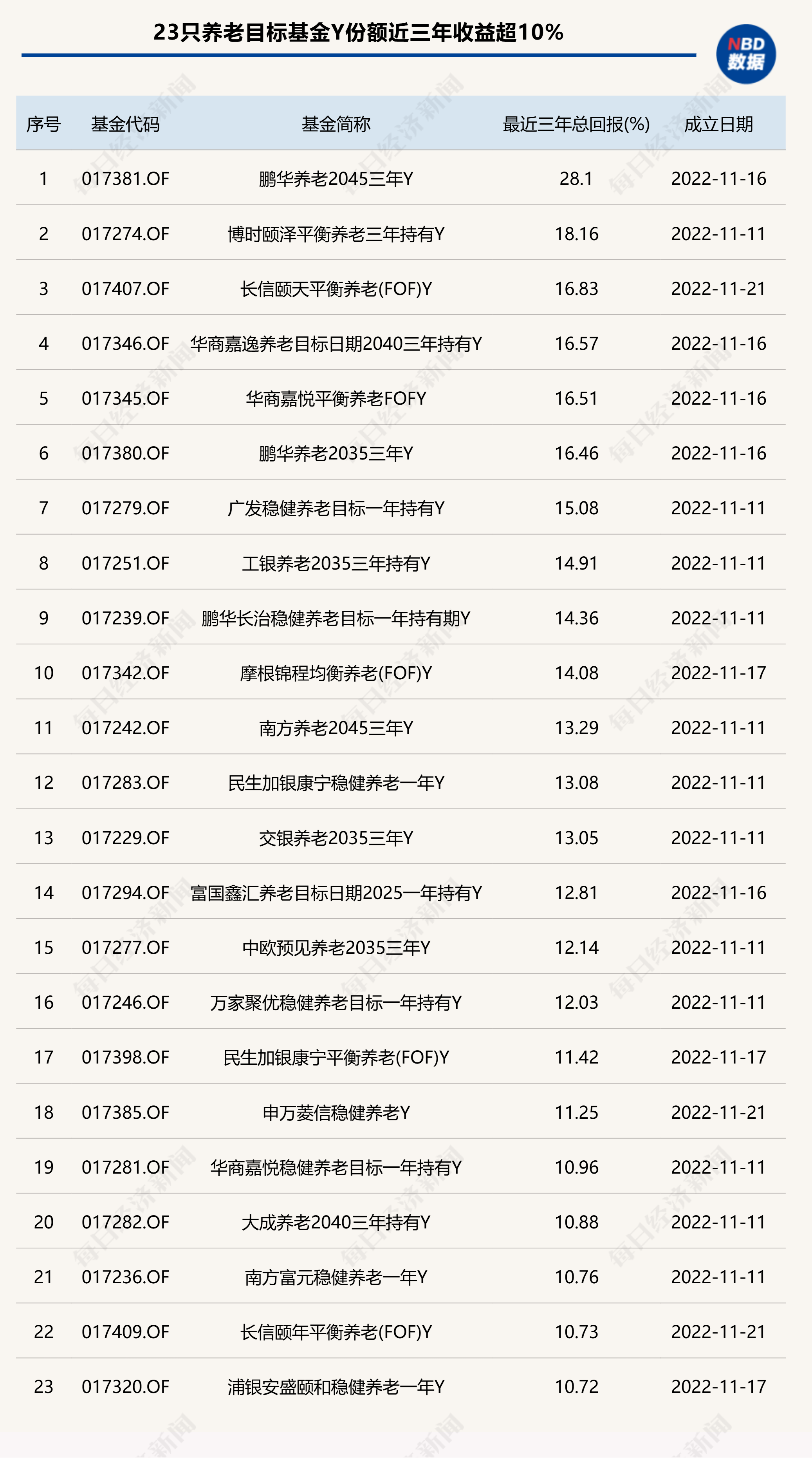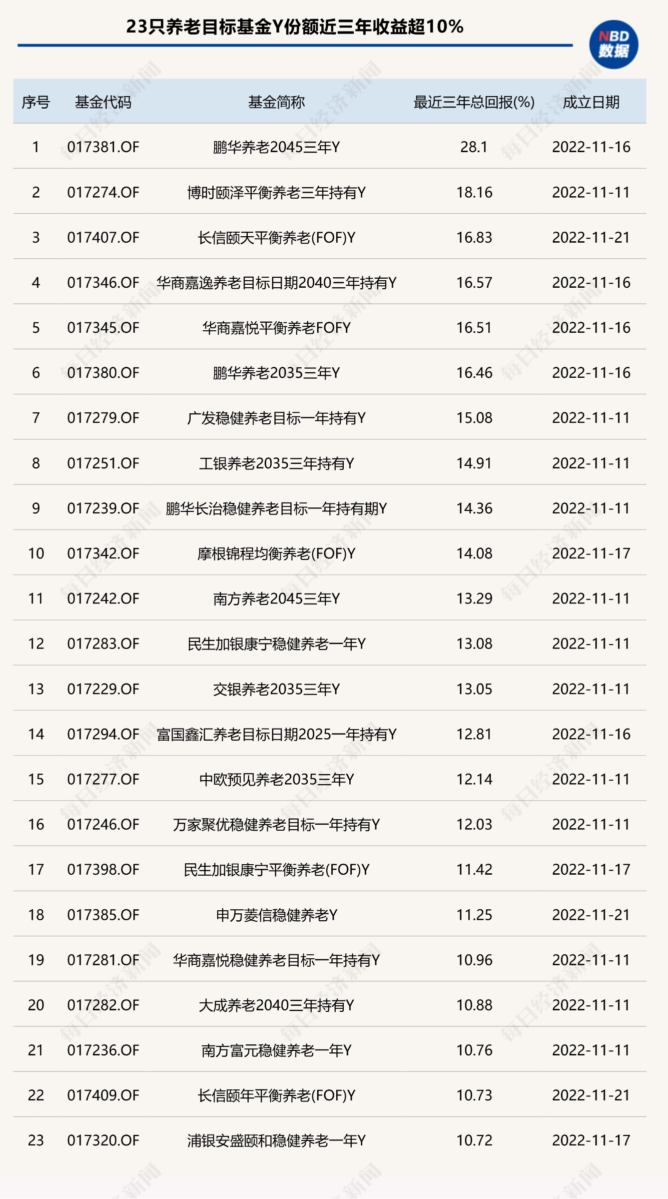 每经记者|黄小聪 每经编辑|彭水萍 自2022年11月25日起,个人养老金制度开始在36个先行城市(地区)实施,转眼间已有3年时间。 3年以来,纳入个人养老金的公募基金产品,从养老目标基金扩充到了指数基金Y份额,那么这些产品目前的规模以及业绩表现如何? 1、23只产品近三年收益超10% 先来看看养老目标基金Y份额产品近三年的业绩表现,Wind数据显示,截至2025年11月20日,共有43只基金有近三年的业绩,其中23只产品的收益超过 10%,1只产品的业绩超过20%。 | 8 | 017251.OF | 工银养老2035三年持有Y | | --- | --- | --- | | 9 | | 017239.OF ● 鹏华长治稳健养老目标一年持 | | 10 | 017342.OF | 摩根锦程均衡养老(FOF)Y | | 11 | 017242.OF | 南方养老2045三年Y | | 12 | 017283.OF | 民生加银康宁稳健养老一年 | | 13 | 017229.OF | 交银养老2035三年Y | | 14 | | 017294.OF 富国鑫汇养老目标日期2025一年 | | 1 ਦੇ | 01 ...