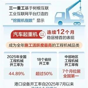 三一重工基于树根互联工业互联网平台打造的"挖掘机指数"显示,2025年大类设备开工率月度榜单呈现 出头部设备优势集中、梯队特征明显的格局。其中,汽车起重机以连续12个月稳居榜首的表现,成为全 年施工活跃度最高的工程机械品类。 "汽车起重机广泛应用于重型基建、能源工程、大型厂房建设等场景,数据直观反映出重大项目建设的 持续性与高强度。"树根科技副董事长杜锦程说,挖掘机与搅拌车形成第二梯队,两者分别对应土石方 作业、混凝土浇筑等基建核心环节,其稳定的上榜表现,折射出住宅建设、市政管网、产业园配套等民 生与产业类项目稳步推进。 "挖掘机指数"显示,港口设备开工率自2025年7月以来连续6个月增长;宁夏、浙江、陕西、贵州等省份 的港口设备开工率位居全国前列。 杜锦程分析,数据反映出内陆省份通过无水港建设、中欧班列联动,"借港出海"的通道效能不断增强; 沿海港口依托航线加密、智慧化升级,集装箱与散货周转效率持续走高;沿边省份依托边境口岸深化跨 境经贸合作,货运需求稳步攀升。同时,港口设备开工率连续多月的增长态势,折射出内外贸一体化协 同发展的韧性不断增强,港口作为物流枢纽的支撑作用愈发凸显。 在细分设备中,堆高机、汽车 ...