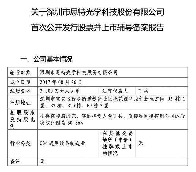 瑞财经 吴文婷近日,深圳市思特光学科技股份有限公司(以下简称"思特光学")启动IPO。 股权方面,公司不存在控股股东,实际控制人为丁兵,直接和间接控制公司的表决权比例为30.36%。目前,丁兵担任公司董事长、经理。 | 辅导对象 | 深圳市思特光学科技股份有限公司 | | | | --- | --- | --- | --- | | 成立日期 | 2017年08月26日 | | | | 注册资本 | 3,000 万元人民币 | 法定代表人 | 1长 | | 注册地址 | 深圳市宝安区西乡街道铁岗社区桃花源科技创新生态园 B2 株 1 层、B2 栋、B10 栋、B9 栋 3 层 | | | | 控股股东 及持股比 | 不存在控股股东,实际控制人为丁兵,直接和间接控制公司的表 决权比例为 30.36% | | | | 例 | | | | | 行业分类 | C34 通用设备制造业 | 在其他交易 场所(申请) 挂牌或上市 | 无 | | | | 的情况 | | | 备注 | 元 | | | 本次IPO的辅导机构为中国国际金融股份有限公司、国金证券股份有限公司,律师事务所为广东信达律师事务所,会计师事务所为容诚会计师事 ...