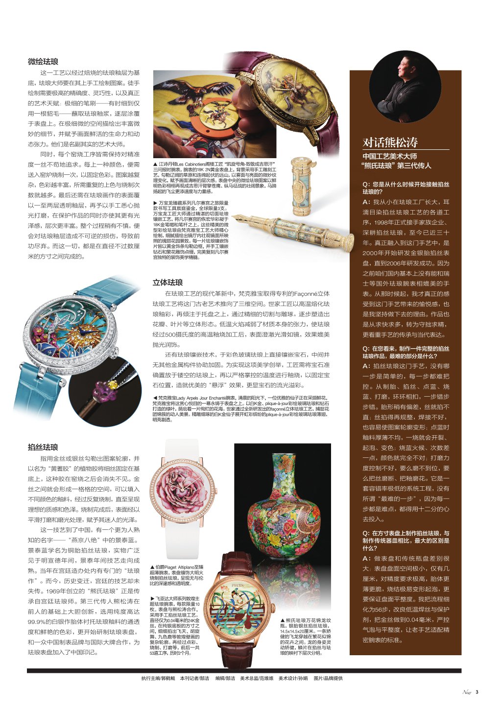 微绘珐琅 这一工艺以经过培烧的珐琅釉层为基 底,珐琅大师要在其上手工绘制图案。徒手 绘制需要极高的精确度、灵巧性,以及真正 的艺术天赋:极细的笔刷 -- 有时细到仅 用一根貂毛 -- 蘸取珐琅釉浆,逐层涂覆 于表盘上。在极细微的空间描绘出丰富微 妙的细节,并赋予画面鲜活的生命力和动 态张力。他们是名副其实的艺术大师。 同时,每个窑烧工序皆需保持对精准 度一丝不苟地追求。每上一种颜色,便需 送入窑炉烧制一次,以固定色彩。图案越复 杂,色彩越丰富,所需重复的上色与烧制次 数就越多。最后还需在珐寅画作的表面覆 以一至两层透明轴层,再予以手工悉心抛 光打磨,在保护作品的同时亦使其更有光 泽感,层次更丰富。整个过程稍有不慎,便 会对法琅釉层造成不可逆的损伤,导致前 功尽弃。而这一切,都是在直径不过数厘 米的方寸之间完成的。 还有珐琅镶嵌技术,于彩色玻璃珐琅上直接镜嵌宝石,中间并 无其他金属构件协助加固。为实现这项美学创举,工匠需将宝石准 确置放于镂空的珐琅上,再以严格掌控的温度进行釉烧,以固定宝 石位置,造前优美的"悬浮"效果,更显宝石的流光溢彩。 这一技艺到了中国,有一个更为人熟 知的名字一 -"燕京八绝"中的景泰蓝 ...