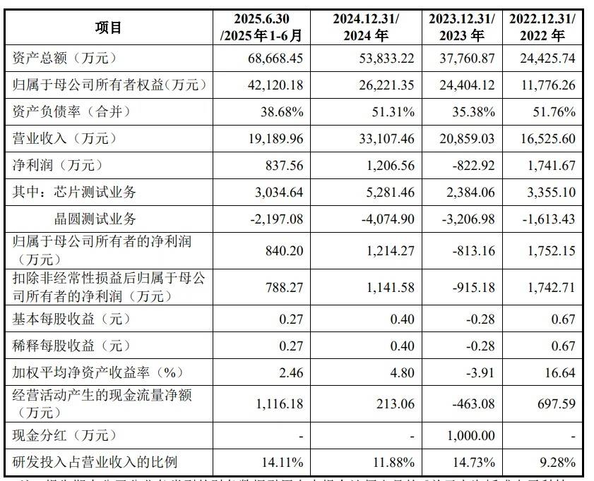 从收入结构来看,芯片测试接口是韬盛科技的核心业务,报告期内占比持续超过60%;探针卡业务则呈现快速增长态 势,收入占比从2022年的18%提升至2025年上半年的25%。公司通过差异化产品策略,有效覆盖了从低端到高端的全场 景测试需求。 | 产品类型 | 2025年1-6月 | | 2024 年 | | 2023 年 | | 2022 年 | | | --- | --- | --- | --- | --- | --- | --- | --- | --- | | | 毛利率 | 收入 | 毛利率 | 收入 | 毛利率 | 收入 | 毛利率 | 收入 | | | | 早 | | 早 | | ਦੇਸ਼ | | 白比 | | 芯片测试 接口业务 | 40.53% | 86.12% | 40.35% | 86.44% | 38.89% | 83.38% | 45.66% | 83.69% | | 探针卡 业务 | 0.66% | 8.21% | 1.23% | 10.38% | 7.55% | 8.16% | 21.20% | 6.63% | | 测试设备 业务 | 32.34% | 5.67% | 30.90% | ...