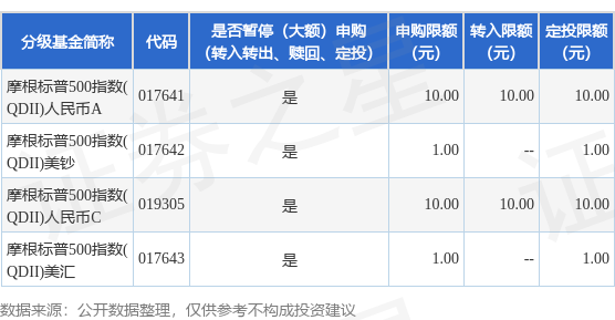 证券之星消息,11月20日摩根基金管理(中国)有限公司发布《摩根标普500指数型发起式证券投资基 金(QDII)调整申购、定期定额投资及转换转入业务限制金额的公告》。公告中提示,为保证本基金的稳 定运作,保护基金份额持有人利益,自2025年11月20日起摩根标普500指数型发起式证券投资基金 (QDII)调整申购、定期定额投资及转换转入业务限制金额,下属分级基金调整明细如下: | 分级基金简称 | 代码 | 是否暂停(大额)申购 | 申购限额 | 转入限额 | 定投限额 | | --- | --- | --- | --- | --- | --- | | | | (转入转出、赎回、定投) | (元) | (元) | (元) | | 摩根标普500指数( QDII)人民币A | 017641 | 를 | 10.00 | 10.00 | 10.00 | | 摩根标普500指数( ODII)美钞 | 017642 | 를 | 1.00 | | 1.00 | | 摩根标普500指数( QDII)人民币C | 019305 | 들 | 10.00 | 10.00 | 10.00 | | 摩根标普500指数( QDII)美 ...
