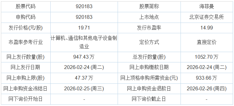 【2月24日IPO雷达】海菲曼申购