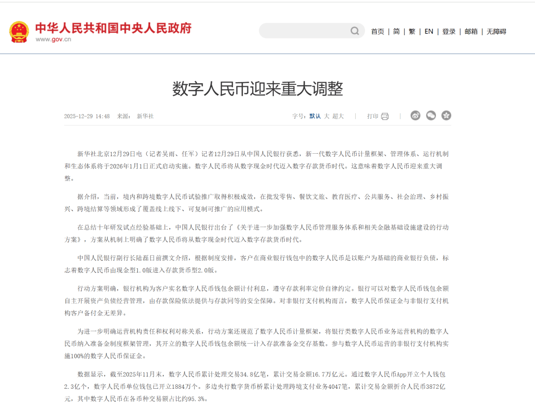 从2026年1月1日起,数字人民币钱包余额开始按照活期存款计付利息。这也意味着,经过十多年研发试点,数字人民币从"数字现金时代"迈入"数 字存款货币"时代。 | 2025年12月26日,上海黄浦区一超市外张贴了店内支持的付款方式列表,包括微信、支付宝、数字人民币等,共有十余种。来源:央视新闻微信 公众号 1 什么是数字人民币? 与虚拟货币有什么区别? 数字人民币是中国人民银行发行的数字形式的法定货币,由指定运营机构参与运营,与实物人民币等价,具有价值特征和法偿性。如果说1.0版数 字人民币是"口袋里的数字纸币",仅承担数字现金的职能,那2.0版数字人民币则是"数字活期存款",标志着数字人民币升级实现了跨越式发展, 从"数字现金时代"迈入"数字存款货币"时代。 数字人民币与虚拟货币存在本质区别,前者是有国家信用背书的法定货币;后者是去中心化的"虚拟资产",价格波动剧烈,缺乏稳定价值基础。 | 2024年9月13日,服贸会首钢园工商银行展台工作人员展示用数字人民币硬钱包过地铁闸机。新华社记者 李鑫 摄 对于消费者来说 此次数字人民币升级有哪些益处? 此次数字人民币升级给老百姓的日常生活带来诸多便利,主要体现在"利 ...