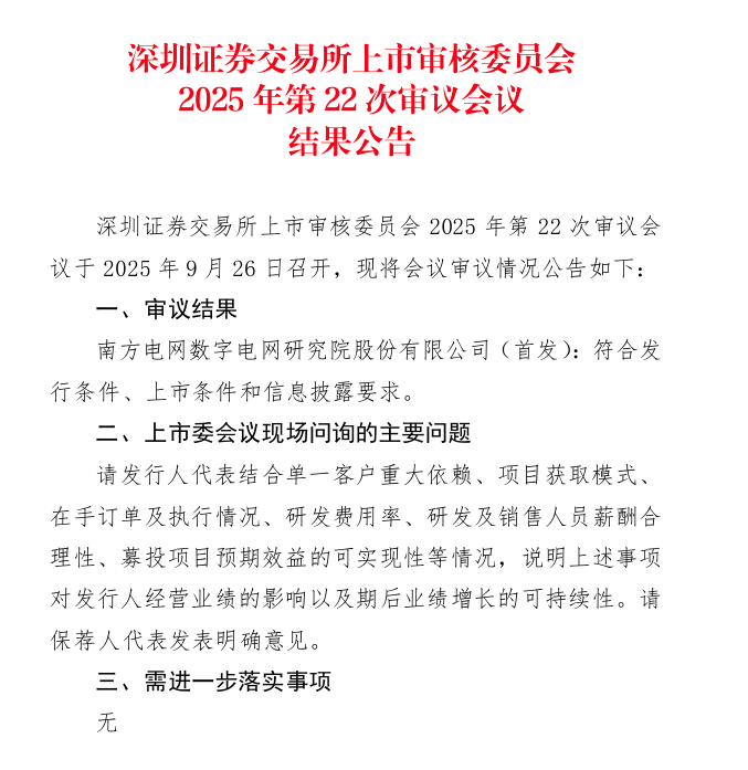 来源:上海证券报·中国证券网 上证报中国证券网讯(记者 时娜)深交所官网披露,南方电网数字电网研究院股份有限公司(下称"南网数字")IPO申请已在近日召开的深交所上市委会议 中获审议通过。 南网数字IPO申请于2025年6月27日获受理,9月26日成功过会,从受理到过会仅用时91天。其高效过会,得益于其深厚的业务根基与清晰的战略定位,也离 不开深交所对"三创四新"企业的精准支持。 根据招股书,作为南方电网孵化的专业数字化企业,南网数字业务涵盖电网数字化、企业数字化及数字基础设施三大板块,在数字电网和能源智能化领域拥 有核心技术。有行业分析人士认为,南网数字显著的行业地位与成长潜力,符合创业板"三创四新"的定位,是其在当前趋严的监管环境下仍能获得监管认可 与市场青睐的关键。 在当前资本市场深化改革的背景下,深交所持续优化发行上市审核机制,积极支持符合国家战略、具备核心竞争力的优质企业登陆资本市场。深交所通过完 善的审核机制实现优质企业与资本市场的高效对接,为行业龙头利用资本平台发展注入动能。 据了解,在监管趋严、上市标准提高的市场环境下,南网数字的快速过会,与其主动提高规范标准,扎实做好申报准备有关。面临回复时 ...