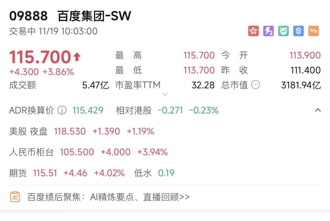 | 115.700+ | 最 高 | 115.700 今 开 | 113.900 | | --- | --- | --- | --- | | +4.300 +3.86% | 最低 | 113.700 昨 收 | 111.400 | | 成交额 | 5.47亿 市盈率TTM | 32.28 总市值 · 3181.94亿 | | 作为全球AI赛场的关键力量,百度在最新公布的2025年第三季度财报中,首次亮出AI业务的成绩单,展现出强劲增长动能。 11月18日晚,百度发布Q3财报,总营收达312亿元,百度核心营收为247亿元。更引人注目的是,其AI业务收入首次对外披露,整体同比增长超过50%, 显示出明确的增长加速度。 值得注意的是,财报发布之后,百度股价双线拉升。11月19日早,百度港股开盘涨超3%。截至18日美股收盘,百度美股股价上涨2.66%。 持续加大AI投入的同时,百度也展现出技术落地的坚定决心。从公众熟知的文心大模型,到底层芯片、上层应用,近期百度世界大会上密集展示的一系 列AI成果,勾勒出百度在AI领域的全栈布局。百度董事长兼CEO李彦宏在当晚的财报会上还强调:"百度始终是一家秉持坚定技术信仰的企业, ...