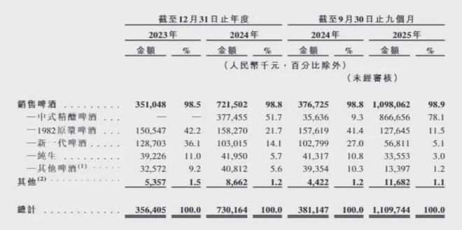 1月13日,河南金星啤酒股份有限公司(以下简称:金星啤酒)递交上市申请,试图以"中式精酿开创者"的说法吸引资本市场。 招股书披露其收入从2022年的3.56亿元跃升至2025年前九个月的11.10亿元,净利率从2023年的3.4%飙升至2025年的27.5%,增长曲线陡峭。 | | | 截至12月31日止年度 | | | | 截至9月30日 | | --- | --- | --- | --- | --- | --- | --- | | | 2023年 | | 2024年 | | 2024年 | | | | 金额 | 90 | 金額 | % | 金额 | 90 | | | | | | (人民幣千元,自分比除外) | | | | | | | | | | (未經 | | 销售啤酒 | 351,048 | 98.5 | 721,502 | 98.8 | 376,725 | 98.8 | | 一中式精髓啤酒 | | - | 377.455 | 51.7 | 35,636 | 9.3 | | 一1982 原炭啤酒 | 150.547 | 42.2 | 158,270 | 21.7 | 157,619 | 41.4 | | ...