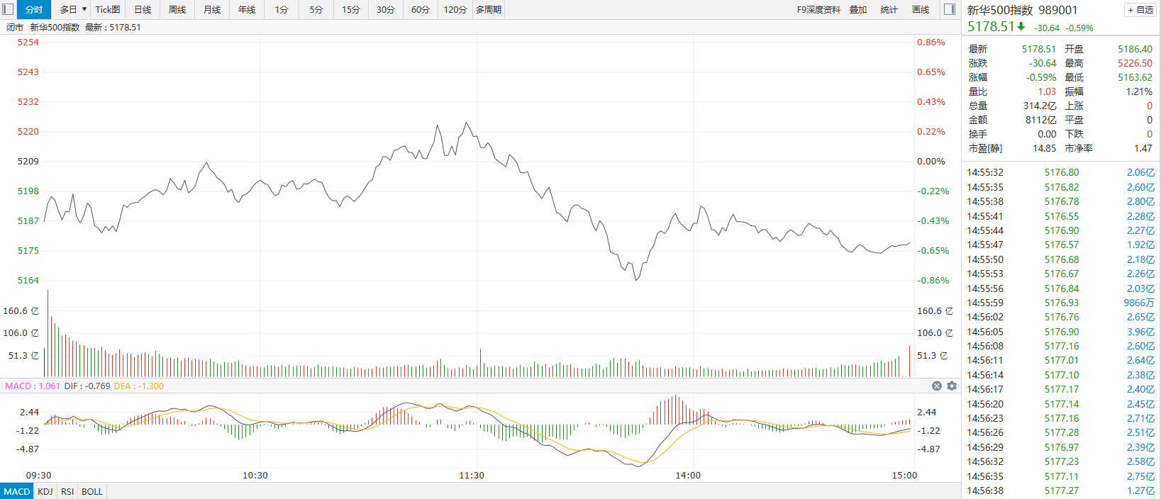 Group 1 - The Xinhua 500 Index (989001) closed at 5178.51 points on October 28, down 30.64 points, representing a decline of 0.59% [1][3] - The index opened lower in the morning, experienced slight upward movement before noon, but saw a significant decline in the afternoon, closing with notable losses [3][4] - The index reached a high of 5226.50 points and a low of 5163.62 points during the trading session, with a total trading volume of 811.2 billion yuan, which was significantly lower than the previous trading day [4] Group 2 - Among the constituent stocks, Fangda Carbon, Quartz Shares, and Dufu Dufu hit approximately 10% limit up, while companies like Sanhua Intelligent Control, Fuyao Glass, and Zhongcai Technology rose over 6% [4] - Conversely, Tongling Nonferrous Metals hit approximately 10% limit down, with significant adjustments seen in companies such as Desay SV Automotive, Huayou Cobalt, and Jiangxi Copper [4]