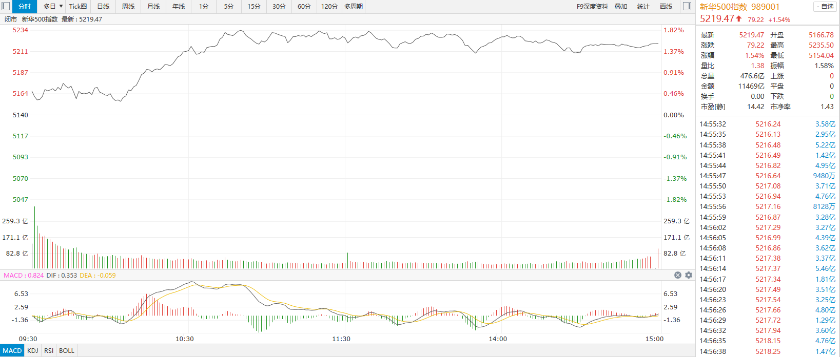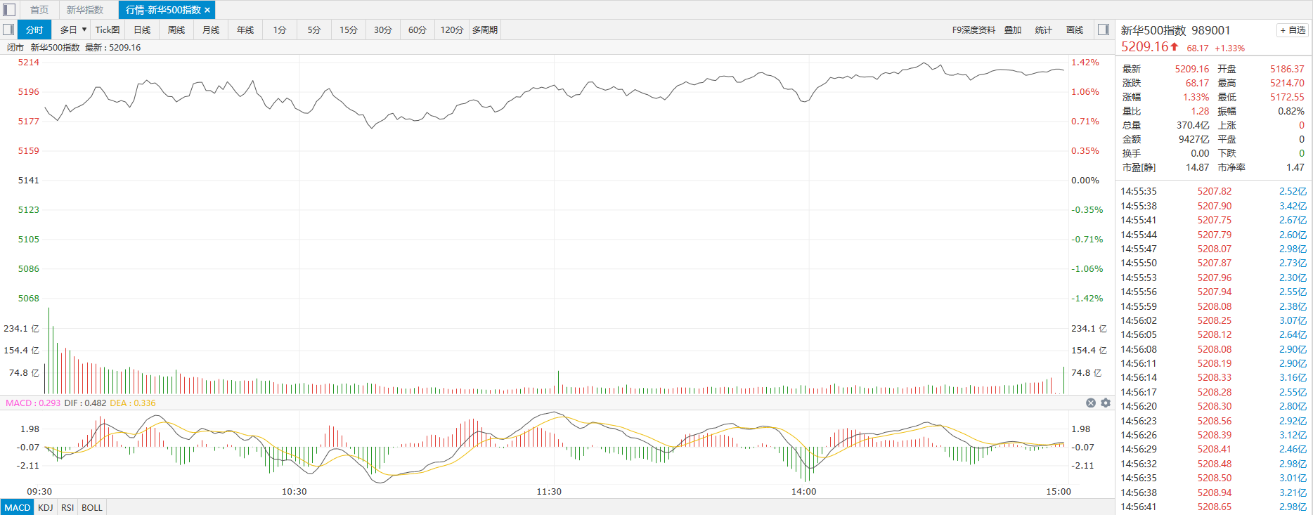 转自:新华财经 新华财经北京10月27日电(罗浩)新华500指数(989001)10月27日收盘上涨68.17点,涨幅1.33%,报5209.16点。 成分股方面,兆易创新、生益科技、厦门钨业、环旭电子收于约10%涨停,振华科技、闻泰科技(维权)、工业富联、高德红外、大华股份、东山精密等多 股涨逾7%;徐工机械、ST华通(维权)、新城控股、晶盛机电、东鹏饮料等跌幅靠前。 新华500指数由国家金融信息平台•新华财经发布,新华指数(北京)有限公司运营维护,指数度量A股主要大中市值股票价格水平。关于新华500指数的详 细信息,请参见新华财经客户端。 编辑:王媛媛 MACD金叉信号形成,这些股涨势不错! 走势上看,新华500指数(989001)27日早间显著高开,指数早盘期间在相对高位窄幅整理,午后波动上扬,收盘时显著上涨。 指数盘中最高触及5214.70点,最低触及5172.55点,成分股全天总成交额报9427亿元,总成交额较上一交易日显著放量。 ...