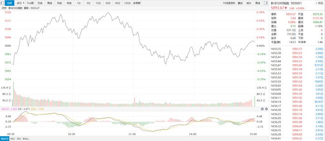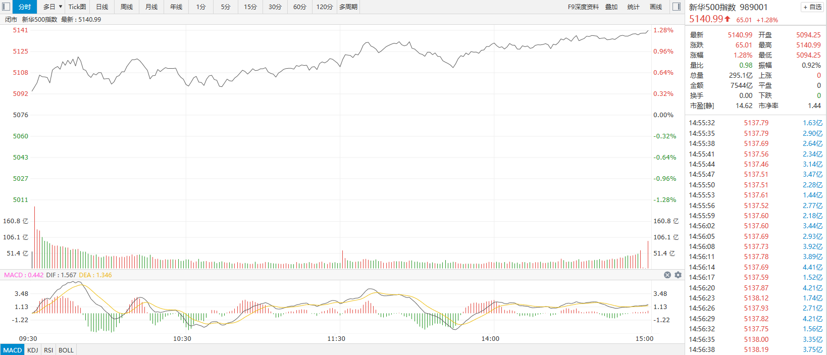 指数盘中最高触及5140.99点,最低触及5094.25点,成分股全天总成交额报7544亿元,总成交额较上一交易日小幅放量。 新华财经北京10月24日电(罗浩)新华500指数(989001)10月24日收盘上涨65.01点,涨幅1.28%,报5140.99点。 走势上看,新华500指数(989001)24日早间高开,指数早盘期间在开盘点位以上的位置窄幅整理,午后波动上扬,收盘时显著上涨。 (文章来源:新华财经) 成分股方面,中际旭创涨逾12%创历史新高,雅化集团、环旭电子、中国卫星、深南电路、汇顶科技等多股收于约10%涨停,北京君正、阳光电源、沪电股 份、澜起科技等涨逾7%;扬农化工、泸州老窖、舍得酒业、恒力石化、潞安环能等跌幅靠前。 新华500指数本周(2025年10月20日至10月24日)累计上涨3.38%。 ...