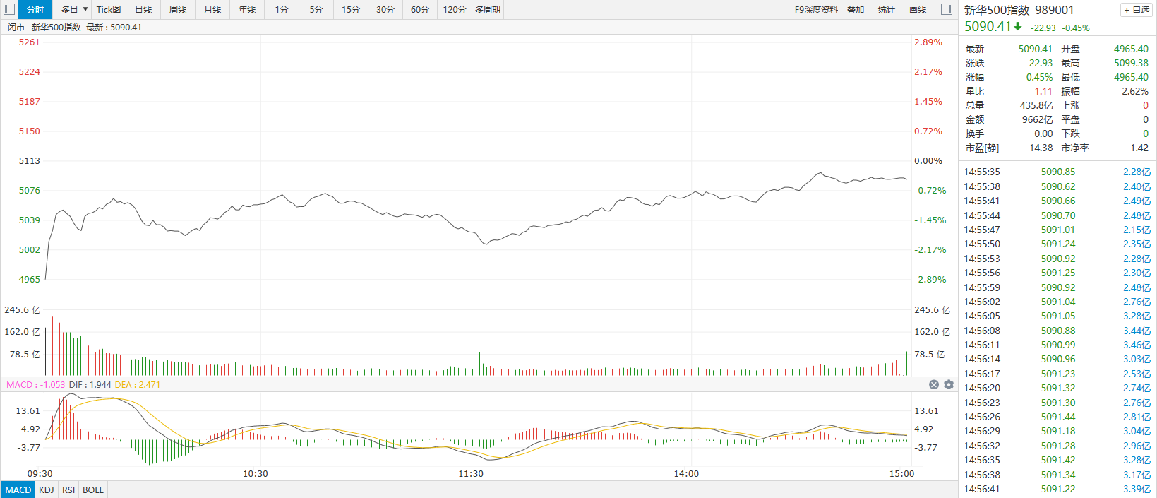 Core Points - The Xinhua 500 Index (989001) closed at 5059.14 points on October 22, down 20.22 points, representing a decline of 0.40% [1] - The index opened significantly lower in the morning and exhibited a fluctuating consolidation trend throughout the day, failing to recover the gap from the previous trading day [2] - The index reached a high of 5072.52 points and a low of 5032.65 points during the trading session, with a total trading volume of 599.9 billion yuan, which showed a significant decrease compared to the previous trading day [3] Sector Performance - Among the constituent stocks, ST Huayuan, Sichuan Road and Bridge, China National Offshore Oil Corporation, CNOOC Services, and Rongsheng Petrochemical showed notable gains [3] - Conversely, stocks such as Stada Pharma, Dufluor, Huatian Technology, Tianci Materials, and Mango Super Media experienced significant declines [3]