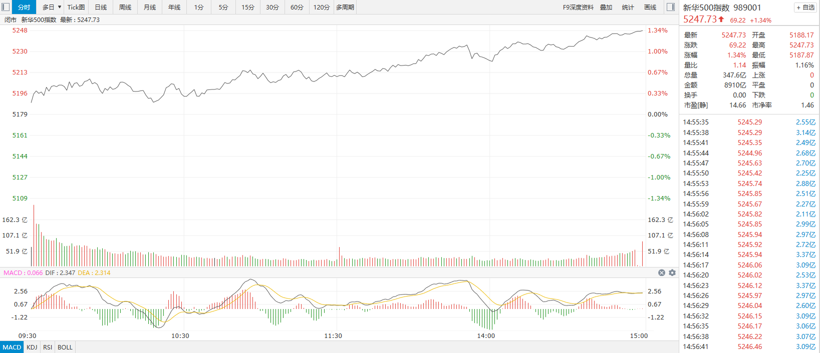 成分股方面,宏发股份、阳光电源、中煤能源、中兴通讯、法拉电子、以岭药业、中国人寿等涨幅靠 前;盛和资源、兴发集团、华菱钢铁、华大九天、中油资本、九洲药业、恒立液压等跌幅靠前。 新华500指数由国家金融信息平台•新华财经发布,新华指数(北京)有限公司运营维护,指数度量A股 主要大中市值股票价格水平。关于新华500指数的详细信息,请参见新华财经客户端。 编辑:王媛媛 走势上看,新华500指数(989001)16日早间小幅低开,指数盘初快速反弹,转涨后有进一步上行,涨 约0.7%后开始逐步回落,午后窄幅整理,收市前小幅翻红。 指数盘中最高触及5127.34点,最低触及5068.47点,成分股全天总成交额报7512亿元,总成交额较上一 交易日缩量。 转自:新华财经 新华财经北京10月16日电(罗浩)新华500指数(989001)10月16日收盘上涨3.84点,涨幅0.08%,报 5093.67点。 ...
