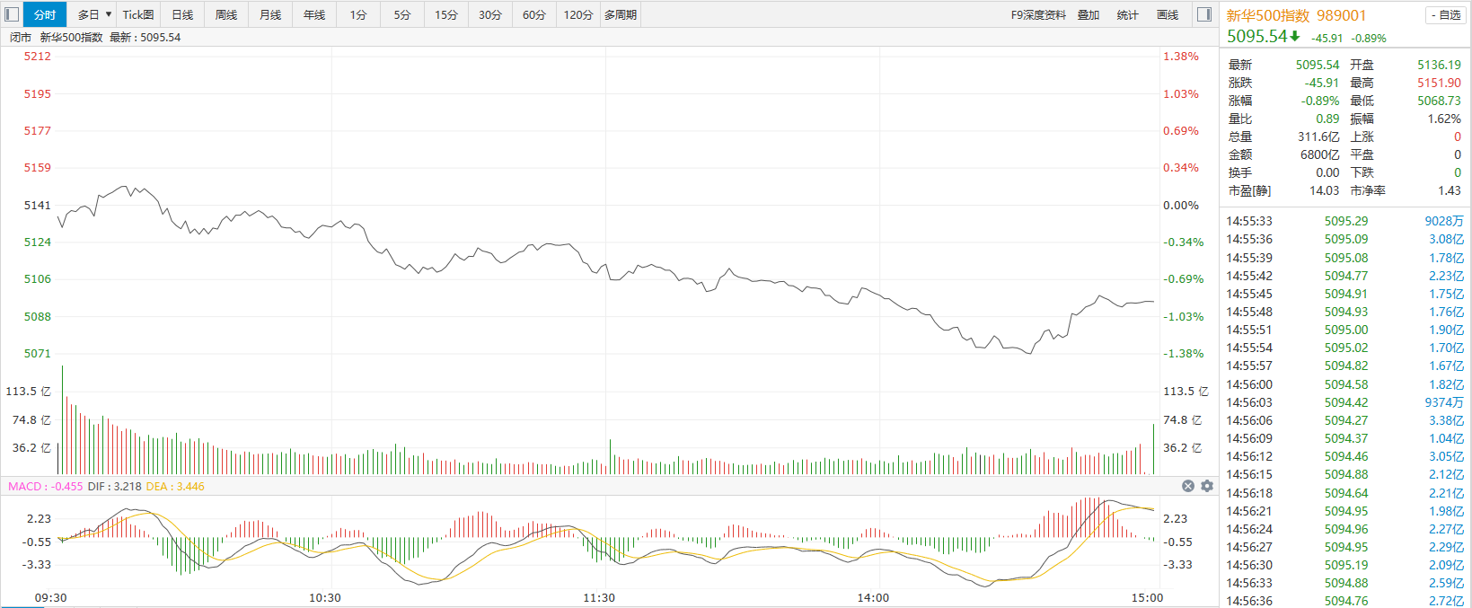 新华财经北京11月4日电 (胡晨曦)新华500指数(989001)11月4日收盘跌0.89%,报5095.54点。 走势上看,新华500指数(989001)4日早间低开后持续调整,午后指数震荡下挫,临近收盘时跌幅有所收窄,最终小幅收跌。指数盘中最高触及5151.90 点,最低触及5068.73点,成分股全天总成交额报6800亿元,成交额较上一交易日有所减少。 成分股方面,中微公司、包钢股份、杰瑞股份、思源电气等成分股涨幅居前;招商轮船、杉杉股份、弘元绿能、扬农化工等成分股跌幅靠前。 (文章来源:新华财经) ...