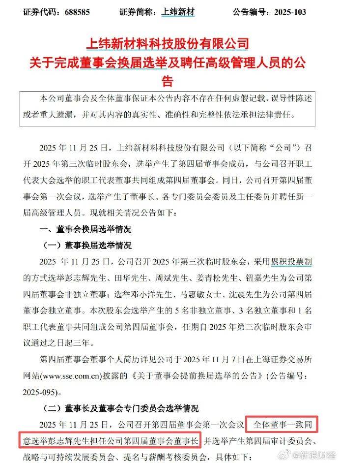 11月25日,上纬新材发布公告称,公司当日召开第三次临时股东会,选举产生了第四届董事会成员。同日,第四届董事会召开第一 次会议,选举彭志辉为第四届董事会董事长,任期至第四届董事会任期届满之日止。 证券简称:上纬新材 公告编号:2025-103 证券代码:688585 上纬新材料科技股份有限公司 关于完成董事会换届选举及聘任高级管理人员的公 告 本公司董事会及全体董事保证本公告内容不存在任何虚假记载、误导性陈述 或者重大遗漏,并对其内容的真实性、准确性和完整性依法承担法律责任。 2025年 11月 25日,上纬新材料科技股份有限公司(以下简称"公司")召 开 2025 年第三次临时股东会,选举产生了第四届董事会成员,与公司召开职工 代表大会选举的职工代表董事共同组成第四届董事会。同日,公司召开第四届董 事会第一次会议,选举产生了董事长、各专门委员会委员及主任委员并聘任新一 届高级管理人员。现就相关情况公告如下: 一、董事会换届选举情况 (一) 董事换届选举情况 图源:上交所 彭志辉1993年出生于江西吉安,本科与研究生均就读于电子科技大学。毕业后,他在OPPO研究院AI实验室担任算法工程师。2020 年,他通过 ...