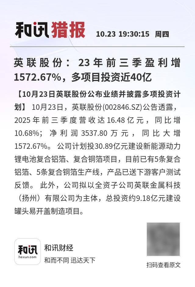 (扬州)有限公司为主体,总投资约9.18亿元建设 罐头易开盖制造项目。 和讯财经 和而不同 讯达天下 英 联 股份: 23年前三季盈利 增 1572.67%、多项目投资近40亿 【10月23日英联股份公布业绩并披露多项投资计 划】 10月23日,英联股份(002846.SZ)公告透露, 2025年前三季度营收达16.48亿元,同比增 10.68%;净利润 3537.80 万元,同比大增 1572.67%。 公司计划投30.89亿元建设新能源动力 锂电池复合铝箔、复合铜箔项目,目前已有5条复合 铝箔、5条复合铜箔生产线,产品已送下游客户测试 反馈。此外,公司拟以全资子公司英联金属科技 【10月23日英联股份公布业绩并披露多项投资计划】10月23日,英联股份(002846.SZ)公告透露,2025 年前三季度营收达16.48亿元,同比增10.68%;净利润3537.80万元,同比大增1572.67%。 公司计划投 30.89亿元建设新能源动力锂电池复合铝箔、复合铜箔项目,目前已有5条复合铝箔、5条复合铜箔生产 线,产品已送下游客户测试反馈。 此外,公司拟以全资子公司英联金属科技(扬州)有限公司为主 体,总投资约9 ...