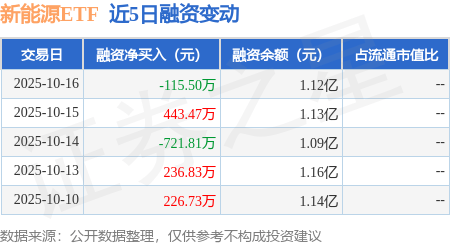 证券之星消息,10月16日,新能源ETF(516160)融资买入748.17万元,融资偿还863.68万元,融资净 卖出115.5万元,融资余额1.12亿元。 | 交易日 | 两融余额(元) | 余额变动(元) | 变动幅度 | | --- | --- | --- | --- | | 2025-10-16 | 1.15亿 | -112.65万 | -0.97% | | 2025-10-15 | 1.16亿 | 475.39万 | 4.27% | | 2025-10-14 | 1.11亿 | -710.28万 | -6.00% | | 2025-10-13 | 1.18亿 | 261.33万 | 2.26% | | 2025-10-10 | 1.16亿 | 155.23万 | 1.36% | | 交易日 | 融资净买入(元) | 融资余额(元) | 占流通市值比 | | --- | --- | --- | --- | | 2025-10-16 | -115.50万 | 1.12亿 | | | 2025-10-15 | 443.47万 | 1.13亿 | | | 2025-10-14 | -721.81万 | 1 ...