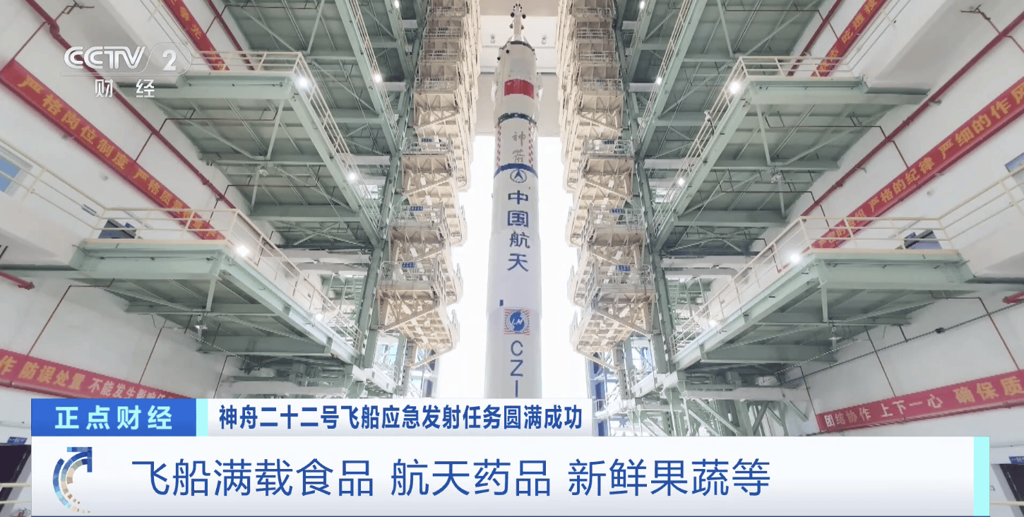 新华社快讯:神舟二十二号飞船为无人状态,装载了航天食品、航天药品、新鲜果蔬、针对神舟二十号飞船舷窗裂纹的处置装置,以及空间站所需的备品备件等