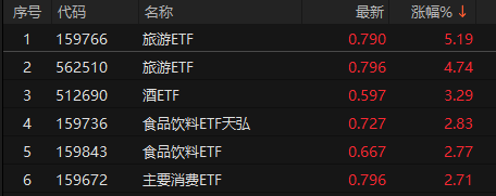 A股三大指数今日涨跌不一,截至收盘,沪指涨0.53%报4018点,深证成指涨0.18%,创业板指跌0.92%。全市场成交额2.19万亿元,较前一交易日增量1742 亿元,近3400股上涨。 盘面上,财政部称将继续实施好提振消费专项行动,大消费板块集体走高,乳业、免税概念、白酒、食品饮料等方向领涨,中国中 免、庄园牧场、酒鬼酒及惠发食品(维权)等多股涨停。 旅游、食品饮料、消费相关ETF霸榜涨幅榜,旅游ETF、酒ETF、港股通消费ETF、食品饮料ETF天弘、食品饮料ETF、食品饮料ETF基金、食品ETF、港股 消费ETF 恒生消费ETF、食品饮料ETF、主要消费ETF、港股通消费ETF华安、恒生消费ETF、港股通消费50ETF、消费ETF龙头、消费ETF南方、港股消费 50ETF、港股消费ETF易方达涨超3%。 | 证券代码 | 证券简称 | 当日涨幅 | 年内涨幅 | | | --- | --- | --- | --- | --- | | 159766.SZ | 旅游ETF | 5.99% | 12.91% | 를 | | 562510.SH | 旅游ETF | 5.66% | 12.94% | र्म | ...