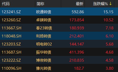 | 代码 | 简称 | | 涨跌幅% ↓ | | --- | --- | --- | --- | | 123241.SZ | 欧通转债 | 592.86 | 15.15 | | 123260.SZ | 卓镁转债 | 173.854 | 10.52 | | 113667.SH | 春23转债 | 180.939 | 7.18 | | 118048.SH | 利扬转债 | 212.401 | 6.10 | | 123203.SZ | 明电转02 | 144.147 | 5.68 | | 113687.SH | 振华转债 | 411.396 | 4.68 | | 123222.SZ | 博俊转债 | 210.835 | 4.58 | | 110096.SH | 豫光转债 | 182.7 | 3.80 | | 代码 | 简称 | 最新 | 涨跌幅% ↑ | | 113695.SH | 华辰转债 | 160.878 | -7.84 | | 113575.SH | 东时转债 | 249.85 | -3.12 | | 123117.SZ | 健帆转债 | 118.552 | -1.66 | | 123234.SZ | 中能 ...