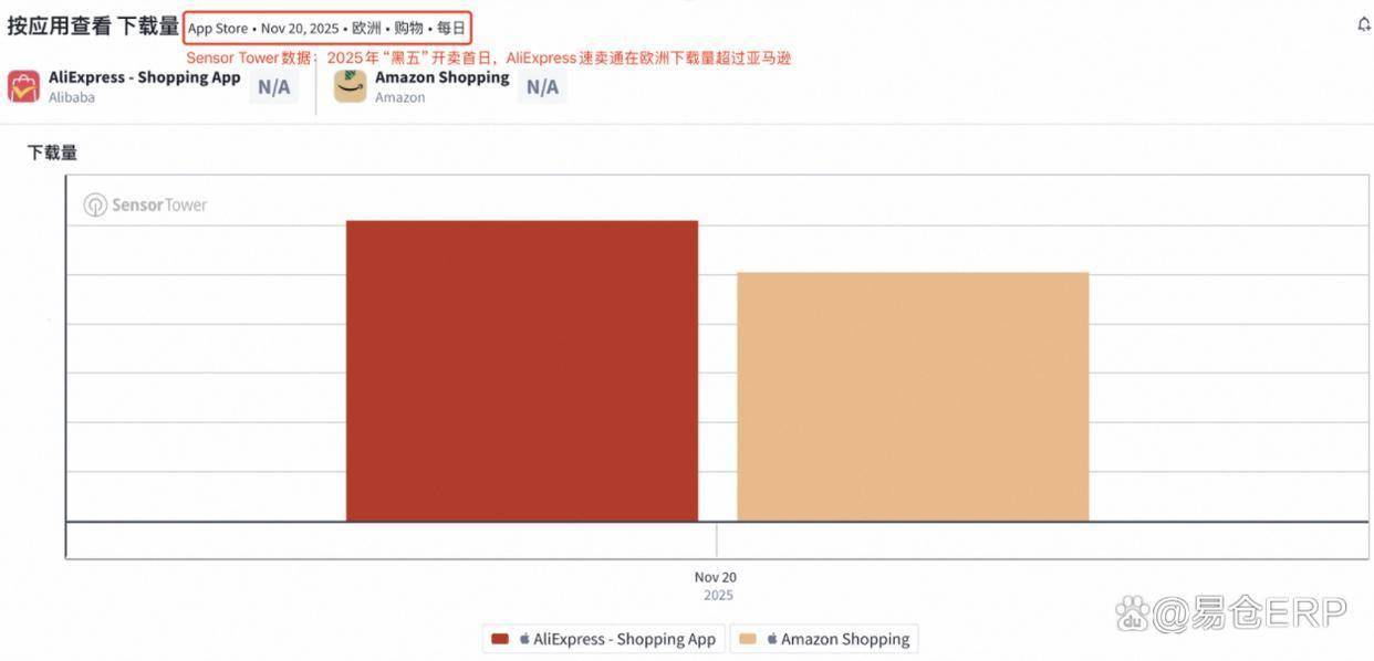 易仓ERP目前已全面 支持亚马逊和速卖通的双平台协同管理,能够 自动抓取并同步来自亚马逊和速卖通的订单,无论是拉单发货还是订单标发,都能在统 一界面高效完成,确保了订单处理的流畅性,为卖家赢得了宝贵的时间。 更深入的挑战在于库存和供应链的协同。面对持续近一个月的超长促销期,如何避免在亚马逊或速卖通上出现超卖断货,同时又不能让库存资金沉淀过多, 考验着卖家的智慧。 欧洲电商市场的年度大戏"黑五大促"向来是巨头亚马逊的绝对主场,但2025年的战局却迎来了历史性转折。 据知名数据平台Sensor Tower披露, 在11月20日黑五开打首日,阿里巴巴旗下平台速卖通在欧洲的下载量实现了对亚马逊的超越。这一信号清晰地表明,欧 洲电商市场的竞争格局正在发生深刻裂变,老牌王者迎来了最具威胁的挑战者。 这场反超并非偶然。 2025年,速卖通全面升级其"超级品牌出海计划",并推出"Brand+"频道,成功吸引了大批实力卖家。 一个标志性事件是, 在双11前,包括洛克兄弟、COMHOMA在内的 多个亚马逊曾经的"类目王"品牌,纷纷将其在速卖通海外仓的备货量提升了一倍。这些 精明的商家不再将鸡蛋放在一个篮子里,而是积极布局多平台运 ...