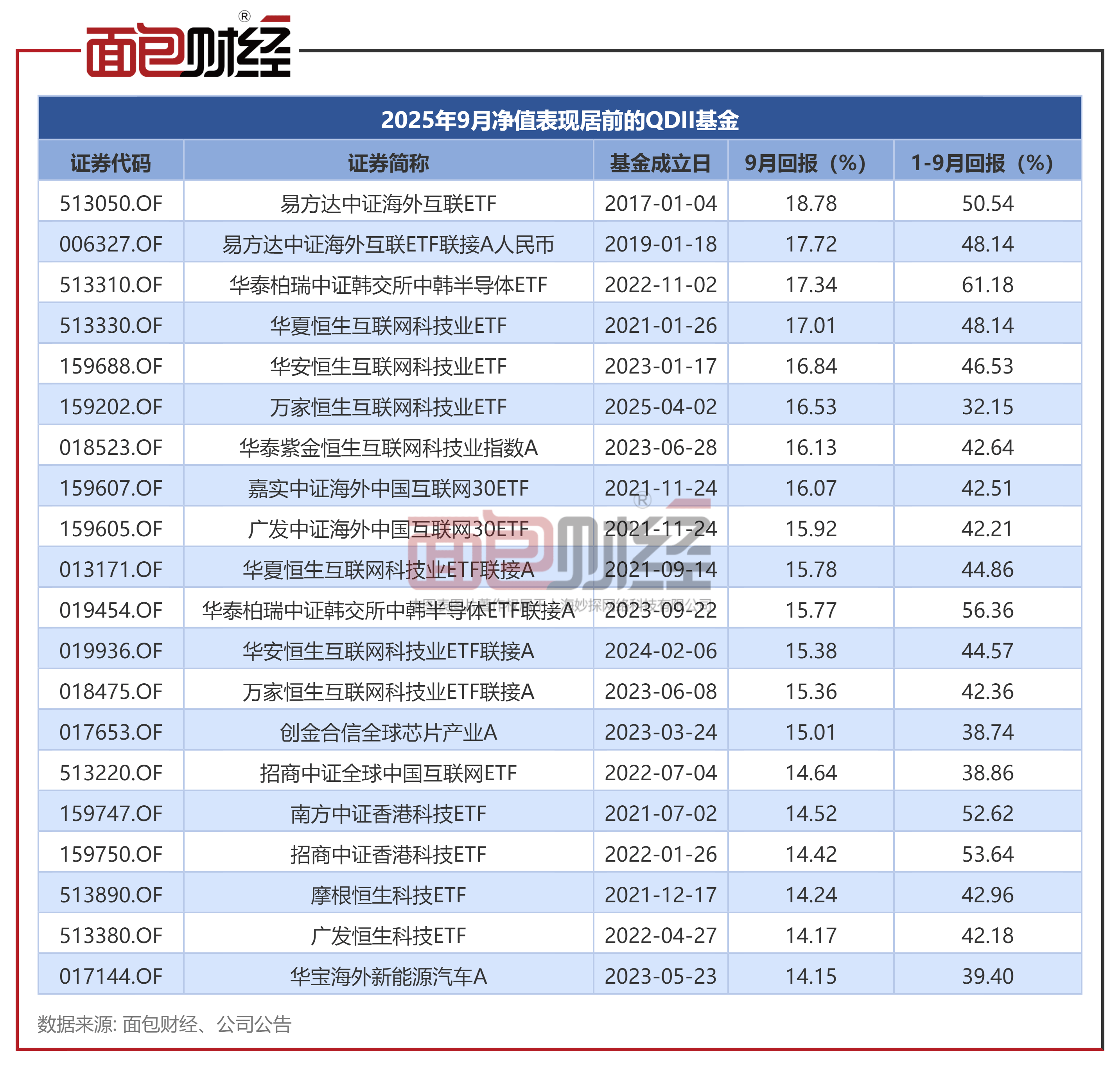 剔除新成立的基金,公募市场披露存续的300余只QDII基金产品(初始基金口径,下同)2025年9月平均回报率为5.92%。 数据显示,9月份,易方达中证海外互联ETF、华夏恒生互联网科技业ETF、创金合信全球芯片产业A等QDII基金表现居前。 具体来看,9月份,收益率居前的QDII基金大多与互联网科技等资产配置相关。 易方达中证海外互联ETF9月表现位居第一,收益率达到18.78%。华夏恒生互联网科技业ETF、嘉实中证海外中国互联网30ETF等基金表现同样居前。 主动权益型基金方面,创金合信全球芯片产业A收益率达到15.01%,业绩居前。数据显示,创金合信全球芯片产业成立于2023年3月,主要精选全球芯片产 业相关证券。据最新财报显示,2025年二季度末,基金重仓股包括中芯国际、华虹半导体、圣邦股份等。截至9月30日,该基金前9月净值上涨38.74%。 另一方面,天弘越南市场A、广发恒生消费ETF等20余只基金9月净值出现回撤。 易方达基金、华夏基金、创金合信基金等旗下产品9月收益率居前 统计显示,剔除新成立的基金,公募市场披露存续的300余只QDII基金产品2025年9月平均回报率为5.92%。 | 面即修 ...