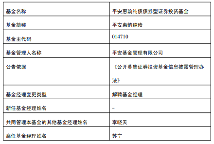 平安惠韵纯债A/C成立于2022年6月9日,截至2025年12月3日,其今年来收益率为0.95%、0.90%, 成立来收益率为12.25%、11.03%,累计净值为1.1201元、1.1102元。 | 基金名称 | 平安惠韵纯债债券型证券投资基金 | | --- | --- | | 基金简称 | 平安惠韵纯债 | | 基金主代码 | 014710 | | 基金管理人名称 | 平安基金管理有限公司 | | 公告依据 | 《公开募集证券投资基金信息披露管理办 | | | 法》 | | 基金经理变更类型 | 解聘基金经理 | | 新任基金经理姓名 | | | 共同管理本基金的其他基金经理姓名 | 李晓天 | | 离任基金经理姓名 | 苏宁 | 中国经济网北京12月4日讯 今日,平安基金公告,苏宁离任平安惠韵纯债,李晓天管理。 苏宁曾先后担任易方达基金管理有限公司固定收益交易员、固定收益研究员兼基金经理助理。曾任 易方达基金管理有限公司易方达稳健收益债券型证券投资基金基金经理助理、易方达信用债债券型证券 投资基金基金经理助理、易方达裕惠回报定期开放式混合型发起式证券投资基金基金经理助理。2019年 6月加入平安基金管 ...