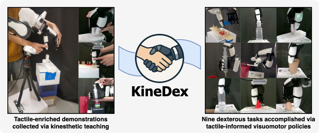 Corl 2025 投稿 量子位 | 公众号 QbitAI 灵巧手技能+1,能帮女友拧瓶盖了! 不仅如此,还能帮忙挤牙膏、插充电器。 结果让 星动纪元灵巧手星动XHAND 1 成功解锁了各种复杂精细操作。 在瓶盖旋紧、牙膏挤压、注射器按压等九项复杂任务中,KineDex平均成功率达74.4%,且数据采集效率相较于遥操提升两倍以上。 该论文已被CoRL 2025接收。 真·手把手引导灵巧操作学习 当前,机器人学习精细操作(尤其那种需要精确力度控制的任务)的难点在于缺乏高质量的"示范数据"。 以往的主流方式有两种,一种是遥操,一种是视频学习。前者的操作者缺乏真实"手感",效率低容易失败;后者通过看人类视频模仿学习,但 人与灵巧手之间存在差异,动作不匹配,且同样没有触觉信息。 来自同济大学、清华、上海交大、香港大学等研究团队提出面向灵巧操作任务的示教与策略学习新方法KineDex框架—— 真·手把手指导的方式,让人类动作直接传递到灵巧手,并同步采集高保真触觉信息。 接下来,处理数据。系统采集到的数据没有办法直接用于视觉运动策略学习,因为摄像头肯定会拍到操作者的手,这会干扰机器人的学习,而 之后它自己操作时是没有人手 ...