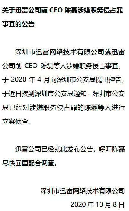 迅雷起诉前CEO陈磊:隐秘掏空公司,操控带宽供应商进行利益输送,追索资产2亿元!后者长期居留海外,此前双方各执一词