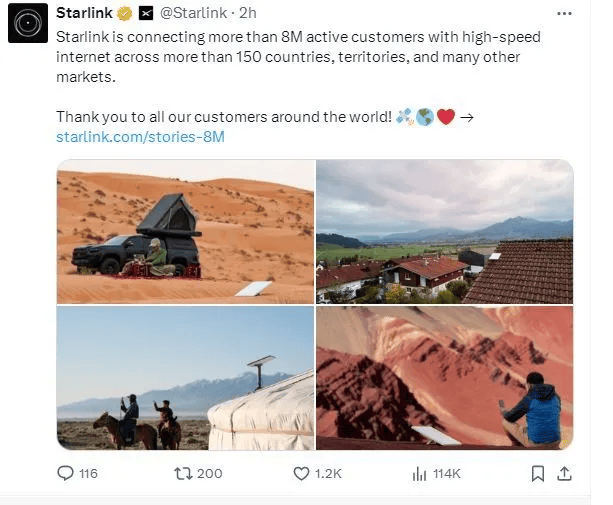 马斯克“星链”全球用户数量突破800万 平均日增14250个新用户