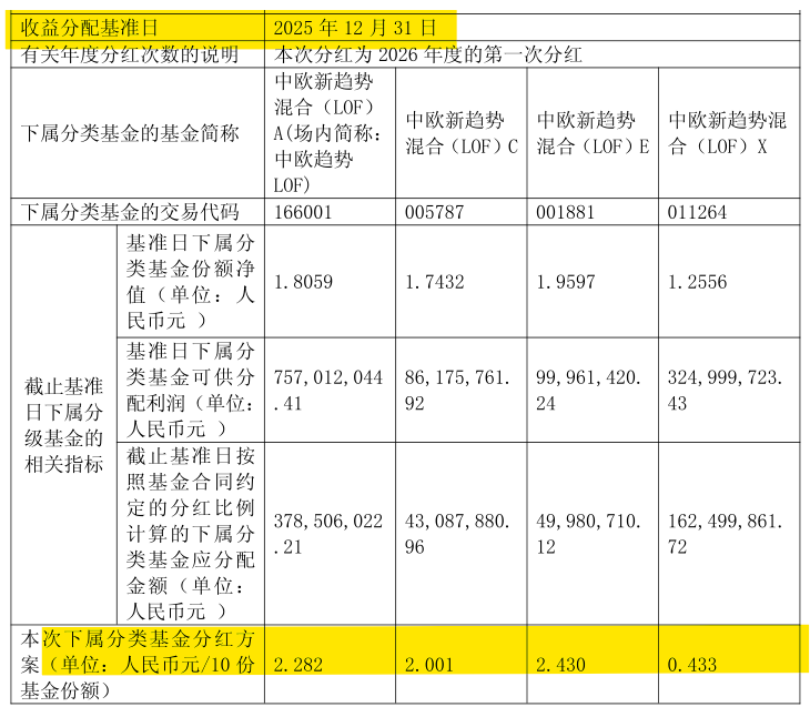 【 导读 】 开年来,一批绩优基金 " 出手 " 分红 中国基金报记者 曹雯璟 2026年开年,多只绩优基金密集宣布分红,且分红比例均达10%以上。 中欧新趋势分红比例超12% 1月12日晚间,中欧基金发布公告称,基金经理周蔚文管理的中欧新趋势将以2025年12月31日为收益基准日,进行2026年度第一次分 红,权益登记日为2026年1月15日。 值得注意的是,这是该基金时隔三年多首次分红,其中A份额的分红方案为2.282元/10份基金份额,按照基准日下属分类基金份额净值计 算,此次分红比例超12%。 | 收益分配基准日 | | 2025年12月31日 | | | | | --- | --- | --- | --- | --- | --- | | 有关年度分红次数的说明 | | 本次分红为2026年度的第一次分红 | | | | | 下属分类基金的基金简称 | | 中欧新趋势 A(场内简称: | | | 中欧新趋势混 | | | | 混合(LOF) | 中欧新趋势 | 中欧新趋势 | | | | | | 混合(LOF)C | 混合(LOF)E | 合(LOF) X | | | | 中欧趋势 | | | | | ...