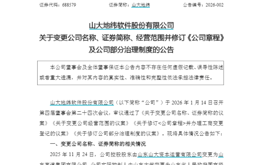 Core Viewpoint - The company Shanda Diwei is undergoing significant changes, including a change in its controlling shareholder to Shandong High-speed Group and a proposed name change to Diwei Intelligent Technology Co., Ltd. This transition aims to enhance its business scope and leverage resources from its new parent company [3][4]. Group 1: Shareholder and Control Changes - In November 2025, Shanda Diwei's controlling shareholder will change from Shandong Shanda Capital Operation Co., Ltd. to Shandong High-speed Group, with the actual controller shifting from Shandong University to the Shandong Provincial State-owned Assets Supervision and Administration Commission [3]. - The company plans to change its name to Diwei Intelligent Technology Co., Ltd. and its stock abbreviation to Diwei Intelligent [3]. Group 2: Business Scope and Financial Performance - Shanda Diwei intends to expand its business scope to include information system integration services, blockchain technology-related software and services, data processing and storage support services, and internet data services [3]. - For the first three quarters of 2025, Shanda Diwei reported revenue of 326 million yuan, a year-on-year decrease of 0.89%, while net profit attributable to shareholders was 31.52 million yuan, an increase of 1.30% [3]. Group 3: Strategic Partnerships and Transactions - Following the transfer to Shandong High-speed Group, Shanda Diwei is expected to leverage the latter's resources to gain entry into transportation sector scenarios [4]. - The company anticipates selling products and services worth 70 million yuan to Shandong High-speed Group and its affiliates in 2026, which would account for 97.75% of similar business transactions [4]. Group 4: Board of Directors and Governance - The board of directors' election announcement indicates the nomination of several candidates with backgrounds in Shandong High-speed Group for the fifth board of directors [6]. - The company will hold its first extraordinary shareholders' meeting of 2026 on February 6, 2026, to review related proposals [8]. Group 5: Financial Management - Shanda Diwei plans to utilize up to 300 million yuan of temporarily idle funds for cash management over a 12-month period [7].