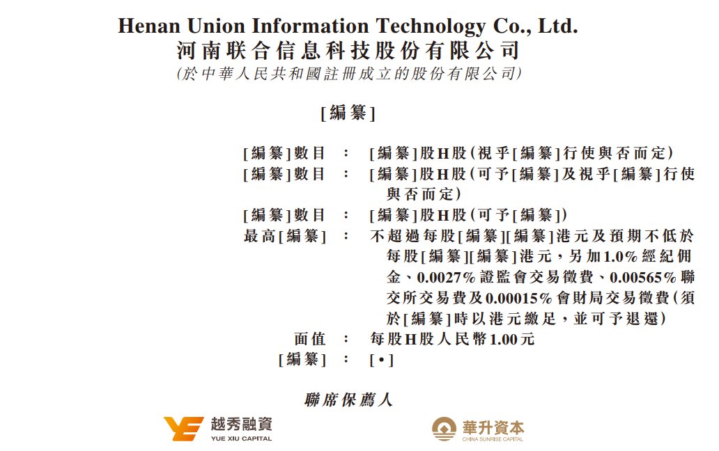 智通财经APP获悉,据港交所11月17日披露,河南联合信息科技股份有限公司(以下简称:联合信息)递表港交所创业板,越秀融资、华升资本为其联席 保荐人。联合信息此前曾于4月25日递表港交所。据招股书,联合信息是一家IT解决方案服务供应商,致力于把握市场趋势所带来的机遇,并为客户提 供IT解决方案服务。公司提供IT解决方案服务,以满足不同客户于IT解决方案服务提供生命周期内的要求及需求。 | [编纂]數目 : | [編纂]股H股(視乎[編纂]行使與否而定) | | --- | --- | | [编纂]數目 .. | [編纂]股H股(可予[編纂]及視乎[編纂]行使 | | | 與否而定) | | 「編纂]數目 : | [编纂]股H股(可予[编纂]) | | 最高[编纂] : | 不超過每股[編纂][編纂]港元及預期不低於 | | | 每股[編纂][編纂]港元,另加1.0%經紀佣 | | | 金、0.0027% 證監會交易徵費、0.00565% 聯 | | | 交所交易費及0.00015% 會財局交易徵費(須 | | | 於「編纂]時以港元繳足,並可予退還) | 据招股书,公司的解决方案通常是为满足客户业务各自独有的 ...