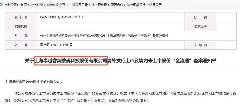 中国证监会国际合作司于近日发布备案通知书,正式同意上海卓越睿新数码科技股份有限公司(下称"卓越睿新")赴香港主板上市及境内未 上市股份"全流通",相关文件于10月16日在证监会官网公开。作为国内知名教育数字化企业"智慧树"的母公司,此次备案通过标志着高等教 育数字化领域头部玩家正式开启境外资本市场融资征程。 | 索 引 号 | bm56000001/2025-00011967 | ক 类 | | --- | --- | --- | | 发布机构 | | 发文日期 | | 称 名 | 关于上海卓越睿新数码科技股份有限公司境外发行上市及境内未上市股份 "全流通"备案通知书 | | | 文 号 | 国合函〔2025〕1781号 | 主题词 | 公开资料显示,卓越睿新成立于2008年,2013年推出核心教育品牌"智慧树",专注于高校数字化教育内容研发与教学场景服务,业务覆盖 教、学、练、考、评、管全流程。 根据弗若斯特沙利文数据,2023年该公司以3.4%的市场份额位列中国高等教育教学数字化市场第二,在细分的数字化教学内容制作市场中更 是以6.2%的份额排名行业首位,服务网络已渗透至全国多数高等院校。 此次赴港上市并 ...