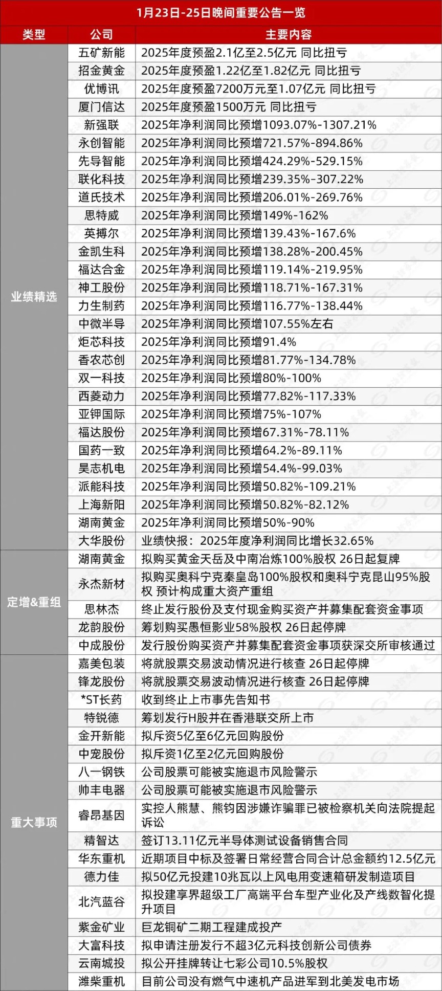 今日看点 ▼聚焦一:思林杰:终止发行股份及支付现金购买资产并募集配套资金事项 公司原拟通过发行股份及支付现金的方式购买科凯电子的股权同时配套募集资金,本次交易预计构成重大资产重组且构成 关联交易,不构成重组上市。由于本次交易规模较大、涉及相关方较多,使得重大资产重组方案论证历时较长。现公司综 合考虑市场环境较本次交易筹划初期已发生一定变化,经公司与交易各相关方友好协商、认真研究和充分论证,基于审慎 性考虑,决定终止本次交易事项并向上海证券交易所申请撤回本次交易事项的相关申请文件。 | 条 开 | 公司 | 主要内容 | | --- | --- | --- | | | 五矿新能 | 2025年度预盈2.1亿至2.5亿元 同比扭亏 | | | 招金黄金 | 2025年度预盈1.22亿至1.82亿元 同比扭亏 | | | 优博讯 | 2025年度预盈7200万元至1.07亿元 同比扭亏 | | | 厦门信达 | 2025年度预盈1500万元 同比扭亏 | | | 新强联 | 2025年净利润同比预增1093.07%-1307.21% | | | 永创智能 | 2025年净利润同比预增721.57%-894.86% ...