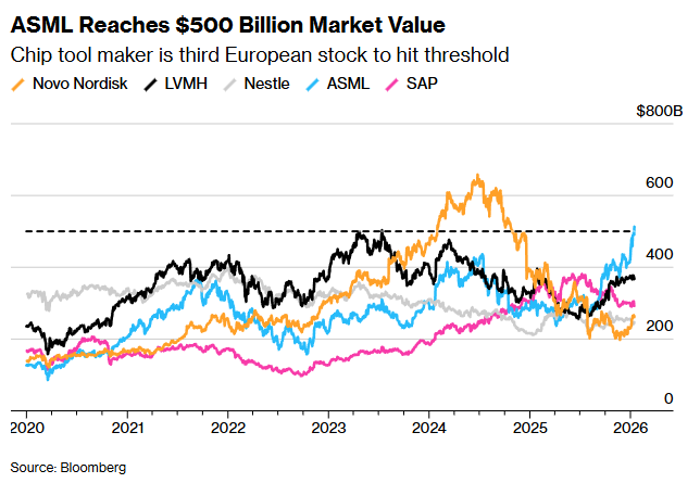 智通财经APP获悉,在核心客户台积电(TSM.US)给出强于预期的2026年业绩指引后,光刻机巨头阿斯 麦(ASML.US)股价飙升至历史新高,推动其市值突破5000亿美元大关。周四,阿斯麦在荷兰阿姆斯特丹 上市的股票价格一度上涨7.6%,年初至今累计涨幅扩大至24%,成为继奢侈品巨头路威酩轩集团 (LVMH)和丹麦制药商诺和诺德之后,第三家市值达到5000亿美元的欧洲企业。截至发稿,阿斯麦美股 周四盘前涨逾4%。 Quilter Cheviot技术研究主管Ben Barringer则表示:"这对科技巨头而言无疑是财报季的一个非常积极的 开端。这些业绩为我们判断芯片公司以及半导体设备供应商的表现提供了良好指引。" 阿斯麦已成长为欧洲市值最高的公司,因为它是台积电制造从苹果(AAPL.US)的智能手机到英伟达 (NVDA.US)的GPU等所有设备所需芯片的唯一尖端光刻机生产商。 值得一提的是,摩根大通近日在其发布的研报中指出,受来自台积电和三星电子的订单推动,阿斯麦将 于美东时间1月28日公布的2025年第四季度业绩预计将给出强劲的订单额表现。小摩预计,阿斯麦第四 季度订单额将达到70亿欧元,较已被不断上调的市 ...
