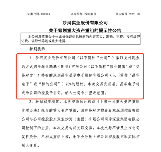21世纪经济报道记者 吴佳楠 深圳报道 在深圳市并购重组"三年行动"政策发布后,首单重大资产重组案例已到来。 10月30日晚,沙河股份(000014.SZ)发布公告,拟以支付现金方式购买深业鹏基持有的晶华电子70% 股权。本次交易完成后,晶华电子将成为公司的控股子公司,纳入公司合并报表范围。 根据公告,本次交易预计构成《上市公司重大资产重组管理办法》规定的重大资产重组,因交易对方控 股股东深圳控股有限公司(简称"深圳控股")与公司控股股东深业沙河(集团)有限公司同为深业集团 有限公司控制下的企业,本次交易构成关联交易。 沙河股份是一家以住宅开发为主的房地产开发公司,深业鹏基经营范围包括房地产经营、物业管理及租 赁经营等。此次交易的标的公司晶华电子经营项目涉及显示屏、显示模块等,曾在2023年冲刺创业板 IPO,后于2024年3月撤回材料并终止IPO。 尽管公告称最终能否达成合作并签署正式协议尚存在不确定性,但这起预计构成重大资产重组交易的公 告,距离深圳市10月22日发布的《深圳市推动并购重组高质量发展行动方案(2025—2027年)》(简称 《行动方案》)仅8天,对于激活深圳资本市场并购活力具有强烈的信号意 ...