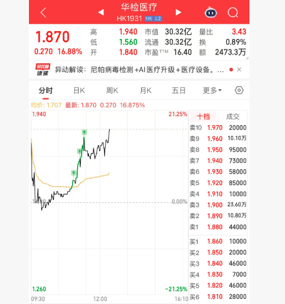 港股异动|华检医疗涨超16% 推出尼帕病毒双平台检测解决方案