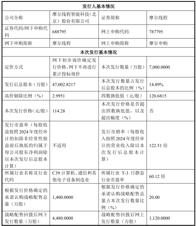 摩尔线程:首次公开发行股份数量为7000万股 发行价格114.28元/股