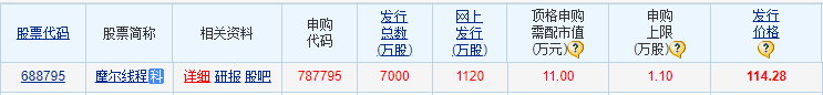11月24日,新股打新市场迎来一只高价新股——摩尔线程的发行申购。它在网上发行1120万股,顶格申购 需配沪市股票市值11万元。 摩尔线程的发行价比较高,为114.28元,这个价格是今年以来发行价最高的新股。由于它尚未盈利,所以 未能有发行市盈率,而行业市盈率为60.12倍。 | | | | 申购 | 发行 | 网上 | 顶格申购 | 申购 | 发行 | | --- | --- | --- | --- | --- | --- | --- | --- | --- | | 股票代码 | 股票简称 | 相关资料 | 代码 | 篇 | 发行 | 需配市值 | FB | | | | | | | (万股) | (万股) | (万元)3) | (万股)3) | (2) | | 688795 | 摩尔维程科 | 详细 班报 股吧 | 787795 | 7000 | 1120 | 11.00 | 1.10 | 114.28 | 这是一只高发行价且还未盈利的新股,这对于一些谨慎型股民来说,在打新时或许会有一些纠结情绪。不 过,摩尔线程属性质地优秀,在其领域内非常有名,因此,应该也有很多积极型股民会踊跃参与申购一 把。毕竟,现在的 ...
