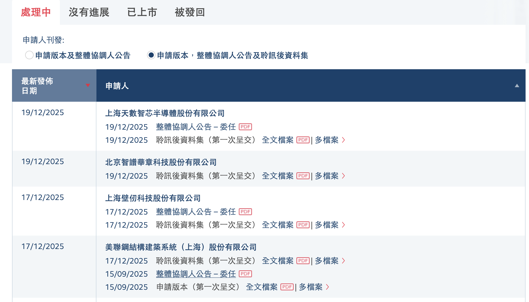 智谱收入主要来自大模型收入,公司毛利率持续保持在50%以上。招股书显示,2022年、2023年、2024年分别拥有54.6%、64.6%、56.3%的毛利率,2025年 上半年毛利率为50%。 12月19日晚间,大模型"六小虎"中,最早启动IPO的北京智谱华章科技股份有限公司(以下简称"智谱"),正式披露了招股书。 | 眾期中 | 沒有進展 | 已上市 被發回 | | --- | --- | --- | | 申請人刊發: | | | | 〔〕申請版本及整體協調人公告 | | ●申請版本,整體協調人公告及聆訊後資料集 | | 最新發佈 | 7 | 申請人 | | 日期 | | | | 19/12/2025 | | 上海天數智芯半導體股份有限公司 | | | | 19/12/2025 整體協調人公告-委任 PDF | | | | 19/12/2025 聆訊後資料集(第一次呈交) 全文檔案 四 | | 19/12/2025 | | 北京智譜華章科技股份有限公司 | | | | 19/12/2025 聆訊後資料集(第一次呈交) 全文檔案 PD | | 17/12/2025 | | 上海壁仍科技股份有限公司 | | | ...