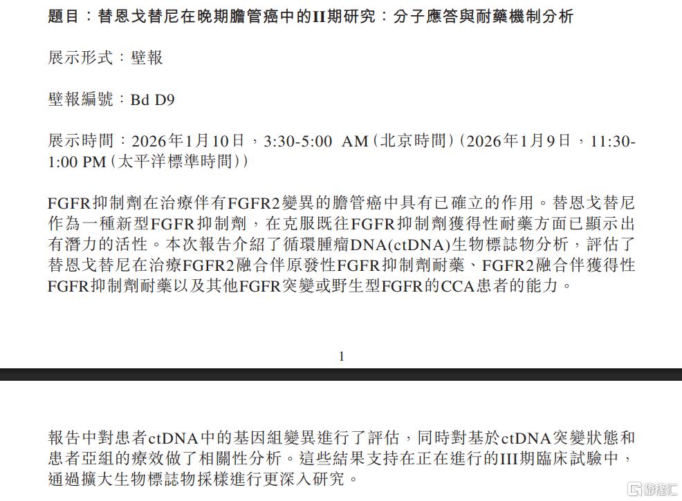 Core Viewpoint - The company announced clinical data for its core product, Tengogatinib, in treating advanced cholangiocarcinoma (CCA) patients at the 2026 American Society of Clinical Oncology Gastrointestinal Cancers Symposium (ASCO GI) [1] Group 1: Clinical Data Presentation - Tengogatinib, a novel FGFR inhibitor, shows potential activity in overcoming acquired resistance to previous FGFR inhibitors in CCA patients [1] - The report includes an analysis of circulating tumor DNA (ctDNA) biomarkers to evaluate the efficacy of Tengogatinib in patients with FGFR2 fusions and primary or acquired resistance to FGFR inhibitors [1] - The study assessed genomic alterations in patient ctDNA and correlated efficacy based on ctDNA mutation status and patient subgroups [1] Group 2: Ongoing Research - The results support further investigation in ongoing Phase III clinical trials by expanding biomarker sampling for deeper analysis [1]