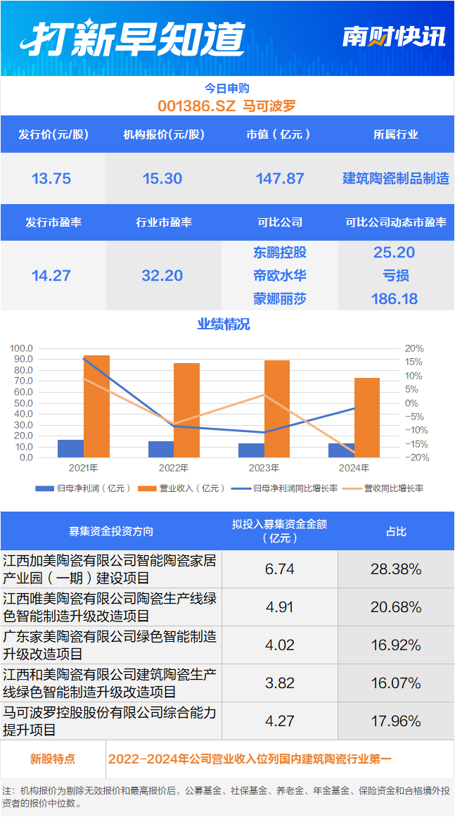 10月13日,可申购深市主板上市的马可波罗(001386.SZ),该公司专注于建筑陶瓷的研发、生产和销 售,是国内最大的建筑陶瓷制造商和销售商之一。 | 打新早知道 | | | 南财快讯 | | --- | --- | --- | --- | | 今日申购 | | | | | 001386.SZ 马可波罗 | | | | | 发行价(元/股) | 机构报价(元/股) | 市值(亿元) | 所属行业 | | 13.75 | 15.30 | 147.87 | 建筑陶瓷制品制造 | | 发行市盈率 | 行业市盈率 | 可比公司 | 可比公司动态市盈率 | | 14.27 | | 东鹏控股 | 25.20 | | 32.20 | | 帝欧水华 | 亏损 | | | | 家哪個沙 | 186.18 | | 业绩情况 | | | | | 100.0 | | | 20% | | 90.0 | | | 15% | | 80.0 70.0 | | | 10% | | 60.0 | | | 5% | | 50.0 | | | 0% | | 40.0 | | | -5% | | 30.0 20.0 | | | -10% | | 1 ...