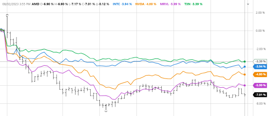 美国芯片股周三普跌,此前AMD收入预期不佳,引发对PC市场脆弱性和企业支出放缓的担忧。 AMD收跌7%, Marvell跌近6%, 英伟达跌近5%,英特尔和德州仪器分别跌超3%,跌幅超过整个科技 市场。 AMD周二晚间表示,预计该公司第三季营收将为57亿美元,而分析师预计营收为58.1亿美元。该公司 表示,"PC市场疲软"拖累其客户部门第二季度收入下降54%。AMD称,数据中心业务的销售额下降了 11%,部分原因是企业需求疲软所致。 半导体企业领跌科技股,原因是惠誉(Fitch Ratings)将美国的长期外汇发行人违约的评级从AAA下调 至 AA+。 惠誉将评级下调归因于"预期未来三年财政状况恶化",即政府治理的削弱和总体债务负担的 增加。 纳斯达克指数在本周三下跌了2.1%,为今年以来第二大跌幅. 在AMD发布财报之后,该公司CEO苏姿丰(Lisa Su)表示,公司正在走出个人电脑行业的"动荡周 期"。但她表示,AMD预计今年下半年将实现增长。Jefferies分析师在给客户的一份报告中重申了对该 股的买入评级,并指出个人电脑市场当前正在复苏。 AMD是为数不多的几家生产人工智能所需高端图像处理器(GPU ...