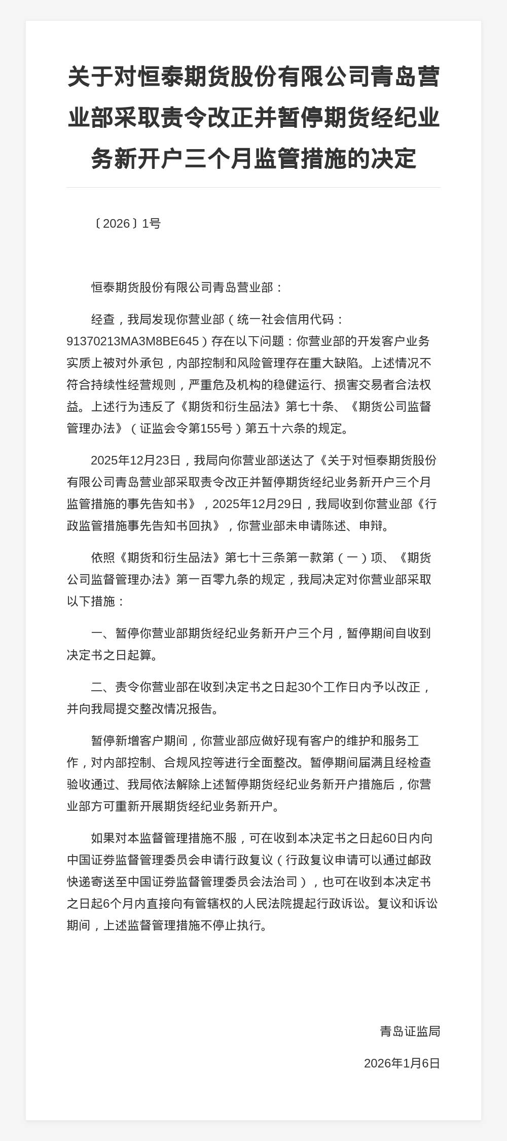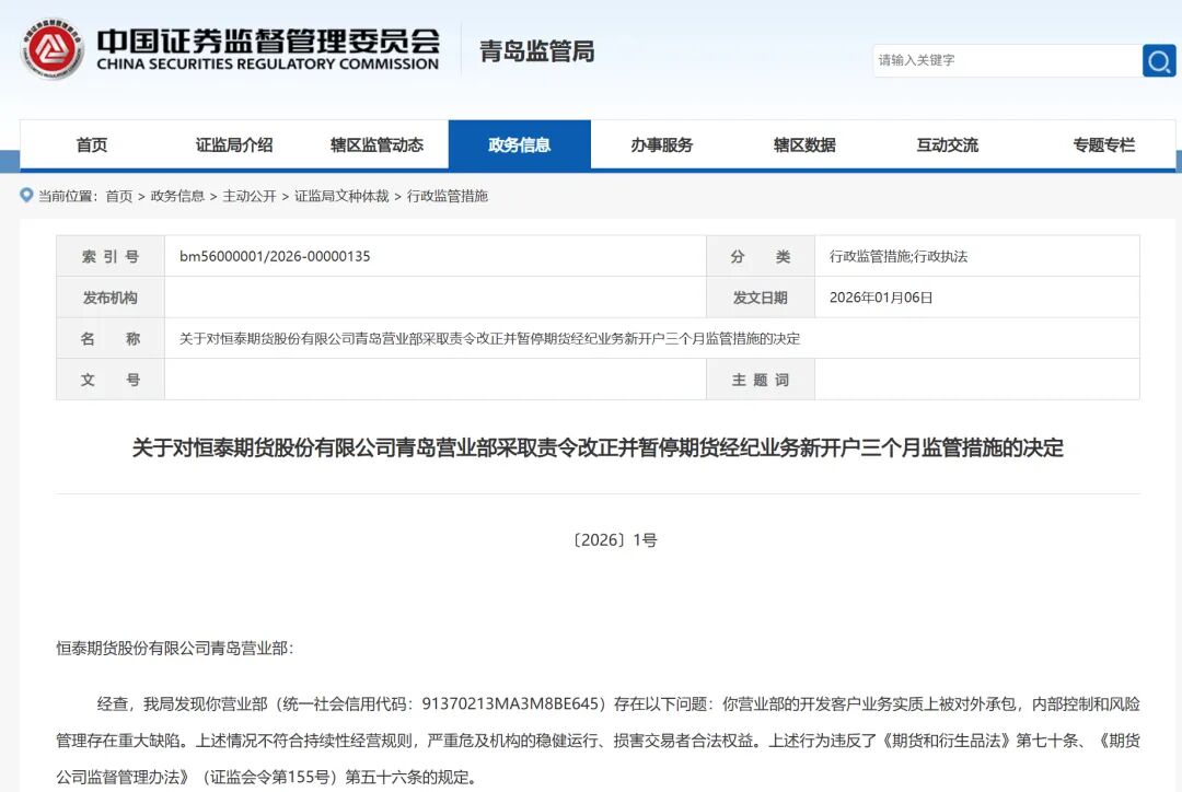 北京商报讯(记者 刘宇阳 实习生 姚榕琰)1月6日,青岛证监局发布公告表示,经查,恒泰期货股份有限公司青岛营业部(以下简称"恒泰期货青岛营业 部")的开发客户业务实质上被对外承包,内部控制和风险管理存在重大缺陷。上述情况不符合持续性经营规则,严重危及机构的稳健运行、损害交易者合 法权益,违反了相关规定。 同时,青岛证监局指出,2025年12月23日,青岛证监局向恒泰期货青岛营业部送达了《关于对恒泰期货股份有限公司青岛营业部采取责令改正并暂停期货经 纪业务新开户三个月监管措施的事先告知书》,2025年12月29日,青岛证监局收到恒泰期货青岛营业部《行政监管措施事先告知书回执》,未申请陈述、申 辩。 青岛证监局决定,暂停恒泰期货青岛营业部期货经纪业务新开户三个月,责令收到决定书之日起30个工作日内予以改正,并提交整改报告。暂停新增客户期 间,恒泰期货青岛营业部应做好现有客户的维护和服务工作,对内部控制、合规风控等进行全面整改。暂停期间届满且经检查验收通过、青岛证监局依法解 除上述暂停期货经纪业务新开户措施后,方可重新开展期货经纪业务新开户。 | 索 引 号 | bm56000001/2026-00000135 સ ...