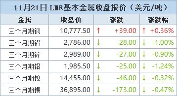 金属普涨 期铜反弹,因股市企稳且投资者仍担忧供应 【11月19日LME收盘】